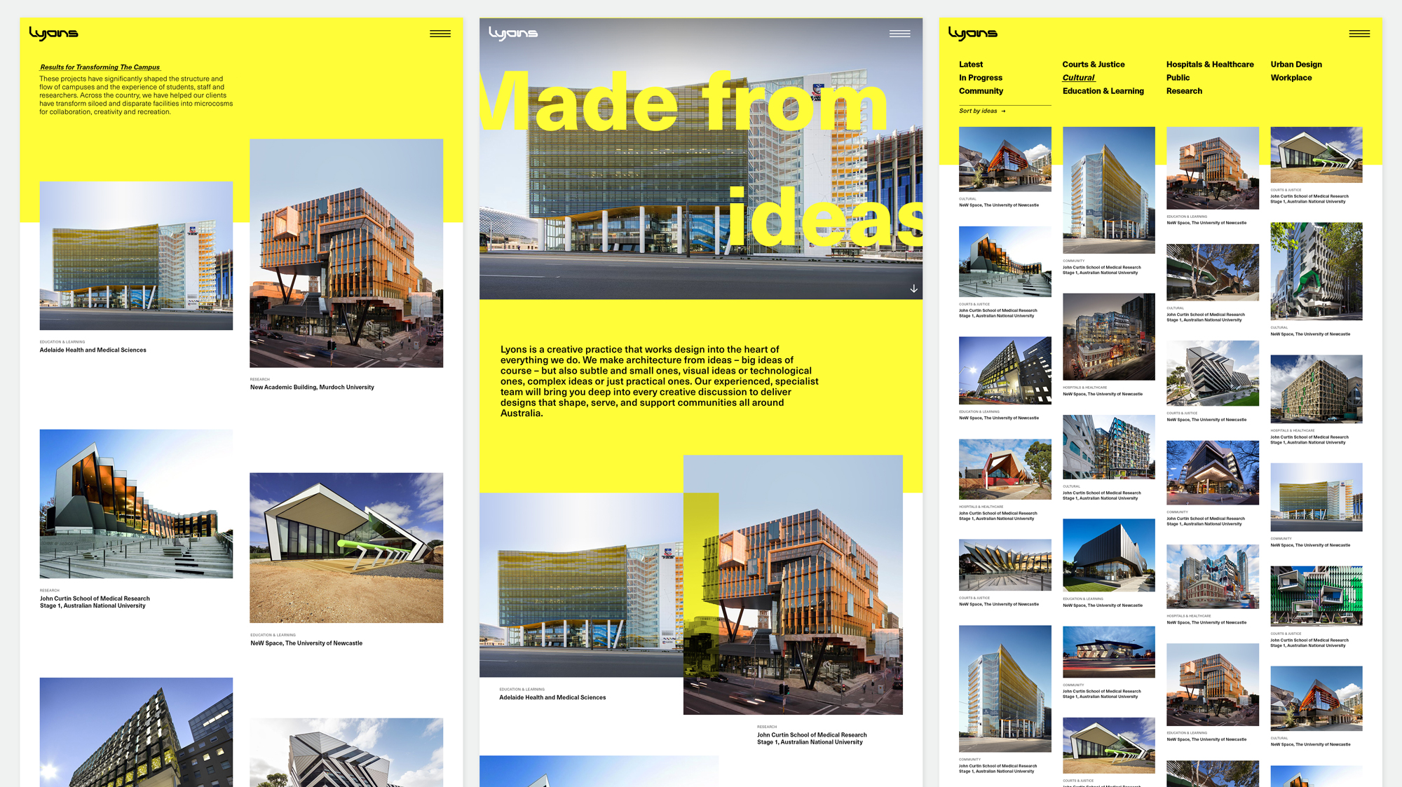 One of Australia’s largest design practices, Lyons Architecture are a Melbourne based practice with a portfolio of projects located across Australia. Their expressive, humanist architecture is built on big ideas. It was important the new website reflect this attribute while bringing justice to their incredible portfolio of extraordinarily difficult and complex projects.